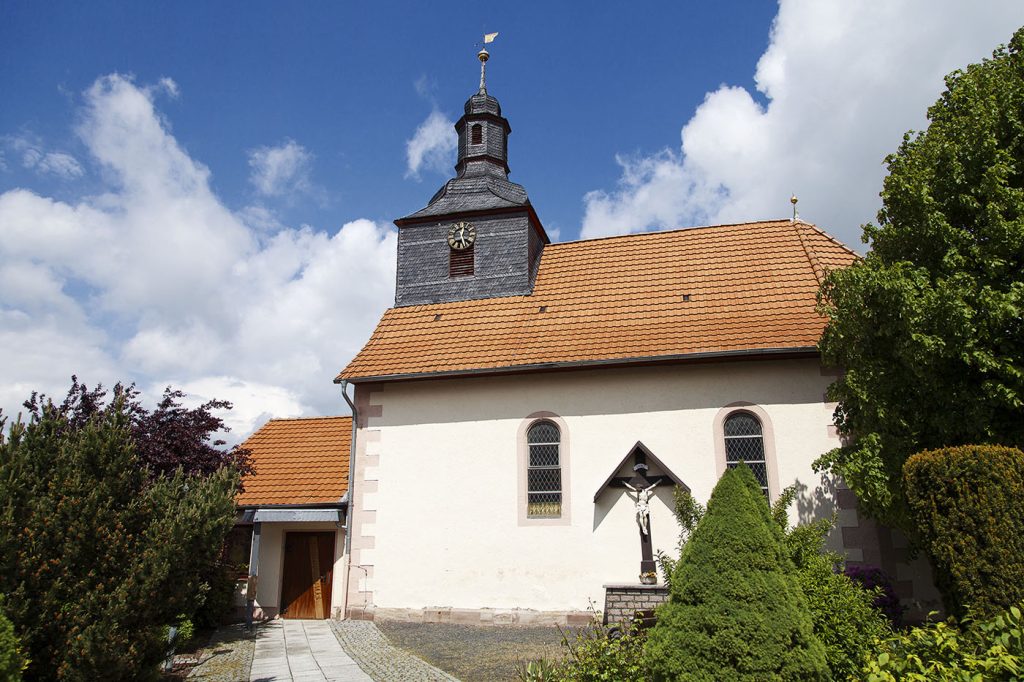 Die Kirche wurde in den Jahren 1713/14 erbaut und im Jahr 1735 durch Weihbischof Christoph Ignaz von Gudenus aus Erfurt geweiht. Der Bau ist ein kleiner zweiachsiger einheitlicher Saalbau. Der Hochaltar wird datiert auf den Beginn des 18. Jahrhunderts. Er zeigt ein Dreifaltigkeitsbild zwischen den Aposteln Petrus und Paulus.